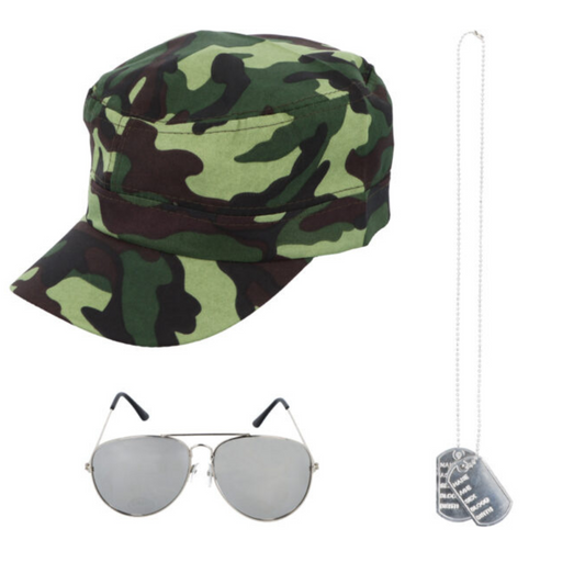 Military Costume Set for Adults – 3-Piece Army Fancy Dress with Camouflage Cap, Aviator Sunglasses, and Dog Tags – Set of 2 for Hen Parties and Stag Dos