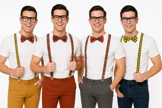 4 Nerd Costume Kit for Men – Includes Braces, Bow Tie & Glasses Frame – Funny Fancy Dress Accessories for Adults & Teens – Perfect for Stag Do, Hen Parties, Comic Con, School Events, Themed Nights & Costume Parties