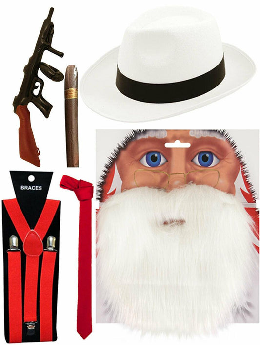 White Gangster Santa Beard Hat Cigar T-Gun Red Braces Tie Christmas Fancy Dress