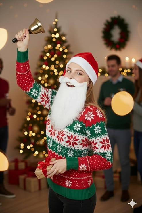 labreeze Bah Humbug Christmas Hat with Santa Beard & Gold Hand-Held Bell – Women’s Funny Christmas Fancy Dress Accessory Set