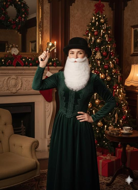 labreeze Black Velour Bowler Hat with Santa Beard & Gold Hand-Held Bell – Women’s Christmas Fancy Dress Accessory Set