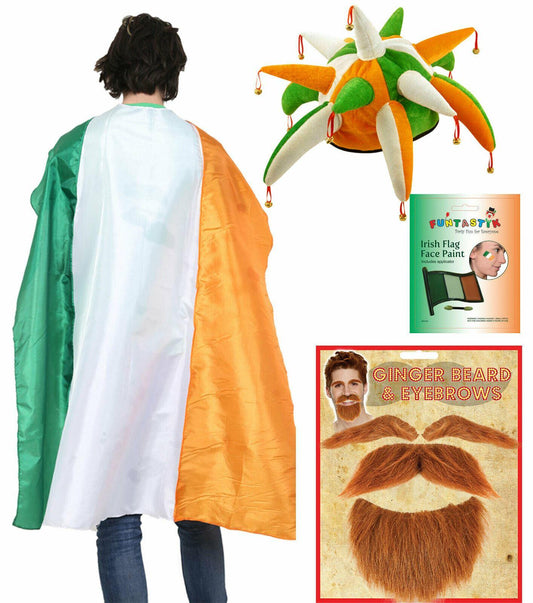 Irish Flag Satin Cape, Jester Hat, Ginger Beard MakeUp St Patrick’s Fancy Dress