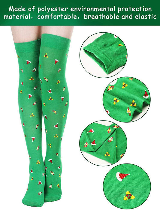 Green Christmas Printed OTK Socks Adults Xmas Party Fancy Dress Hold Up