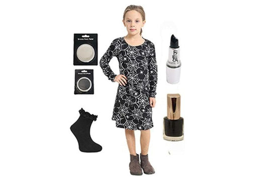 Girls Spooky Spiderweb Set Spider Print Swing Drees with Black Nail Polish Wig Lip Stick Face PAINT