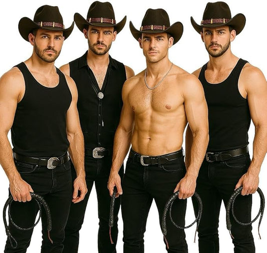 labreeze Brown Cowboy Hat with Teeth & Explorer Whip (2m) Set for 4 – Perfect for Western, Cowboy, Explorer Themed Costumes – Ideal for Group Costumes, Halloween, Cosplay, and Themed Parties