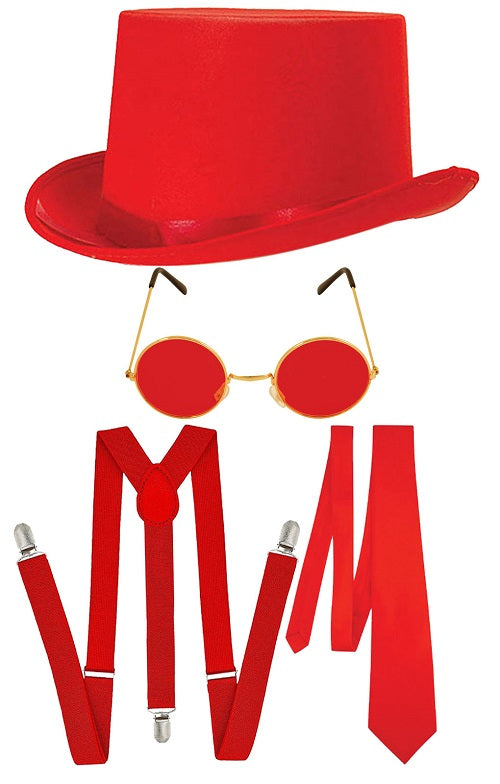 Stand Out in Style Red Satin Top Hat, Matching Tie, Adjustable Braces & Classic Round Glasses Set - Elevate Your Ensemble for Weddings, Parties, and Special Occasions