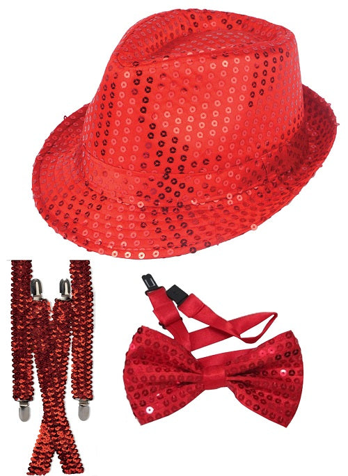 Sparkling Red Sequin Hat, Bow Tie, and Braces Set Stand Out in Style