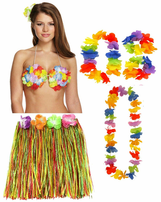 Ladies Multi Hula Skirt 40 cm 4 Pcs Lei Flower Bra Hawaiian Beach Party Costume