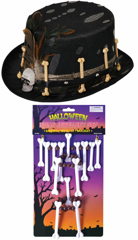 Black Voodoo Top Hat Bone Necklace Jewellery Set Halloween Horror Fancy Dress