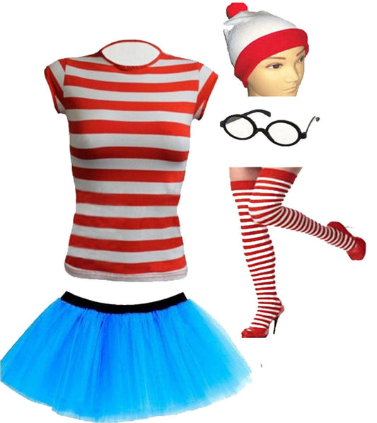 LADIES STRIPED RED WHITE T-SHIRT SET WHERES CHARACTER FANCY DRESS COSTUME