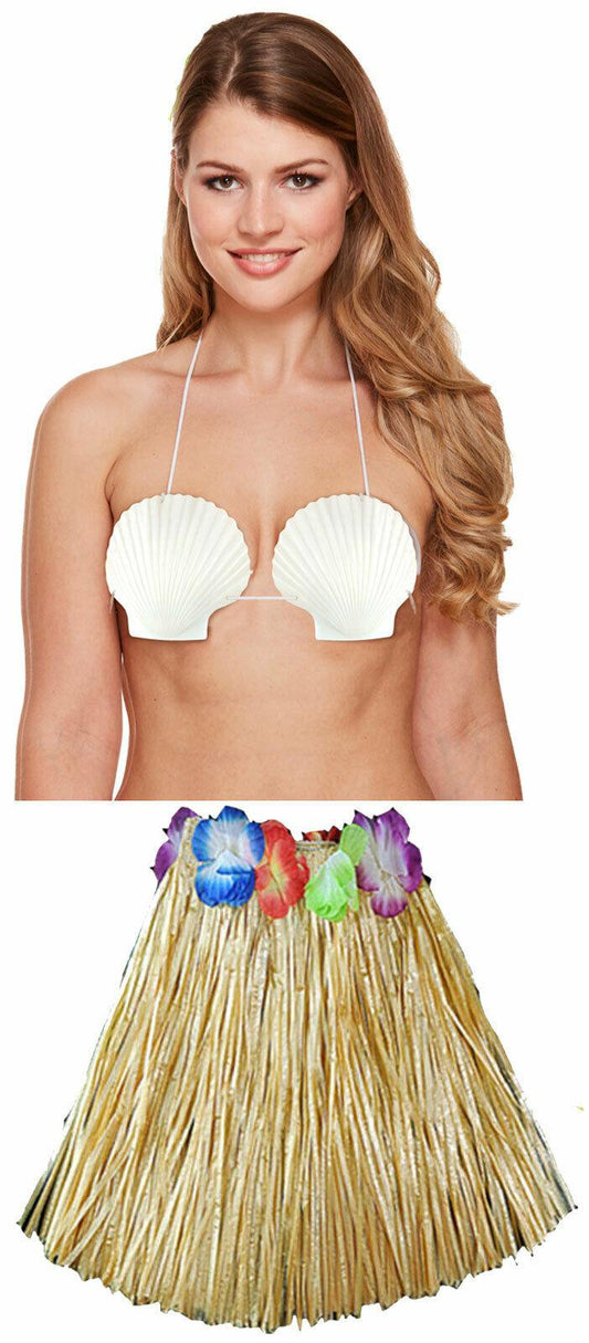 Ladies 40 cm Hula Skirt Lei Set Shell Bra Hawaiian Summer Beach Party Costume