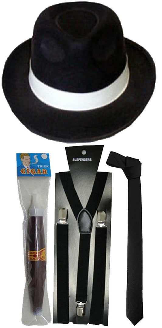 GANGSTER BRACES TIE HAT & CIGAR 1920s COSTUME ROARING 20s PIMP FANCY DRESS