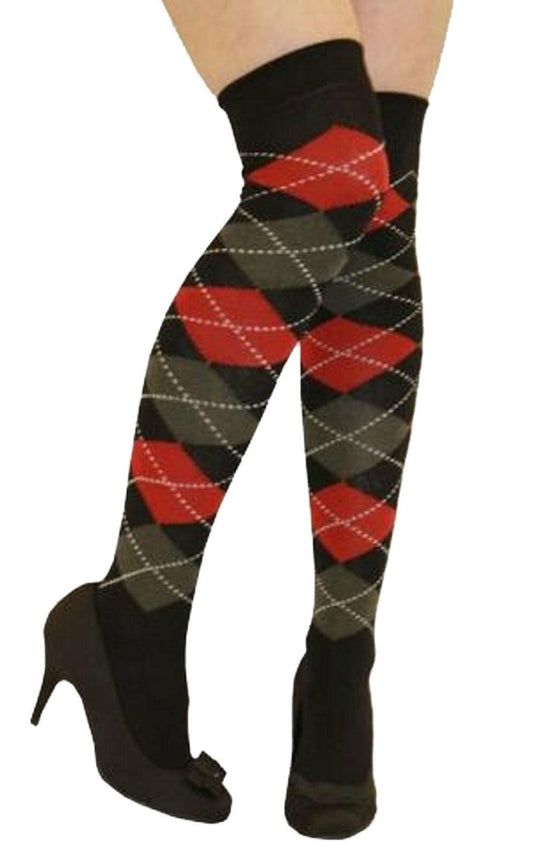 Ladies Argyle Black Red Thigh High Girls Stretchy Over the Knee Socks