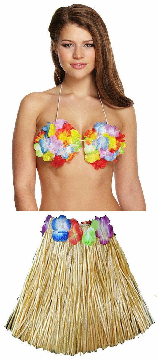 Ladies Girls 40 Cm Hula Grass Skirt Flower Bra Hawaiian Summer Beach Party Set