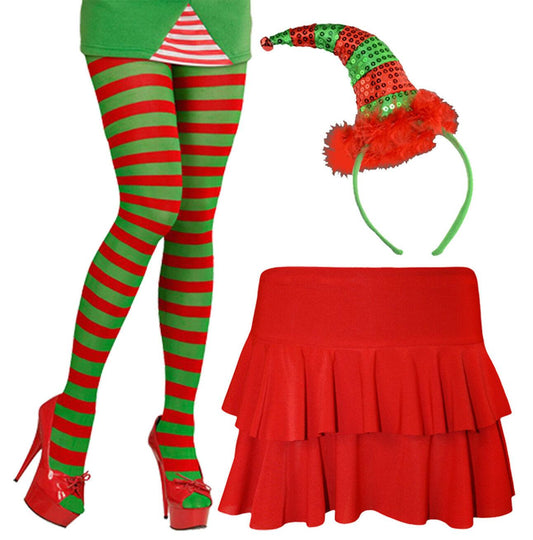 Ladies Christmas Santa Elf Red Green Tights Sequin Headband Rara Skirt Costume