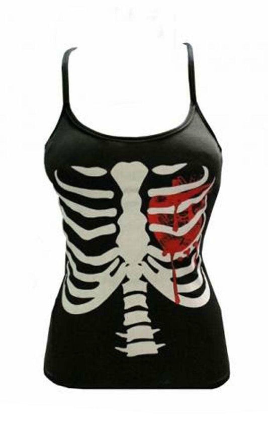 Ladies Halloween Skeleton with Bloody Heart Printed Womens Black Vest Top