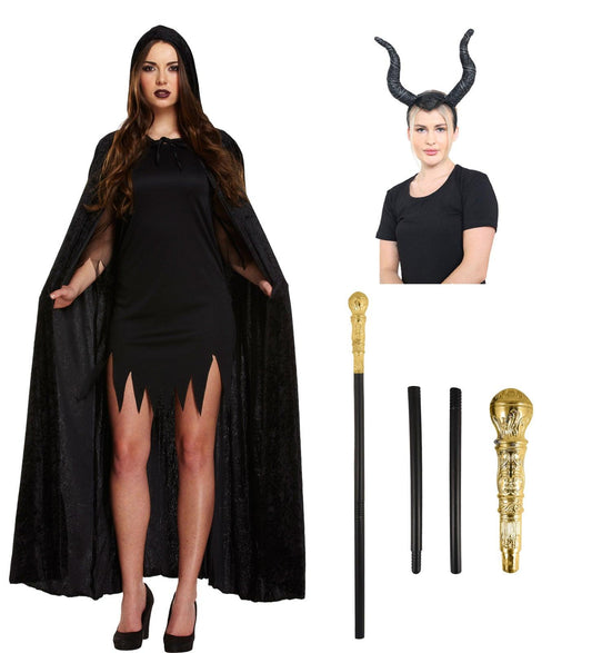 Elegant Black Velvet Hooded Cape, Fairytale Witch Horns Headband & Gold Pimp Cane Halloween Witch Costume Set.