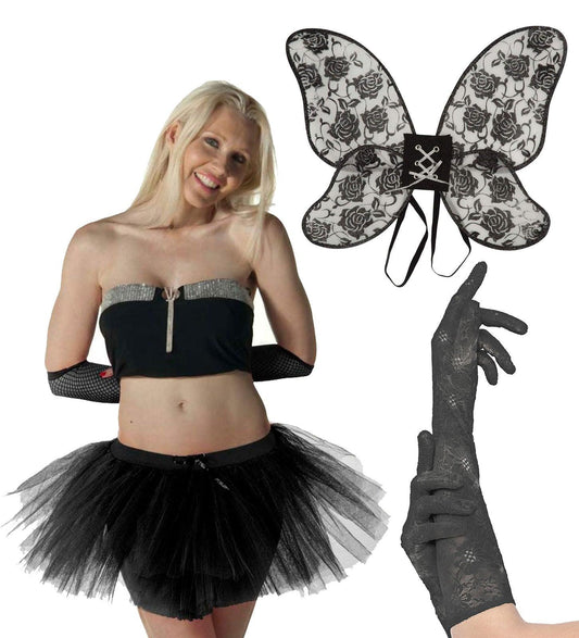 Enchanting Black Glitter Rose Fairy Wings, Tutu Skirt & Long Lace Gloves Halloween Fortune Teller Costume Set