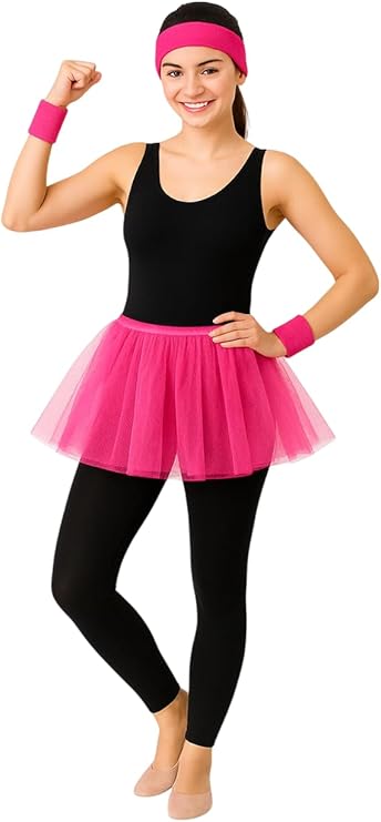 Pink 3-Layer Tutu Skirt with Pink Towelling Headband and Wristbands – Women’s Fancy Dress Costume Set – Neon 80s Outfit for Parties, Runs & Festivals