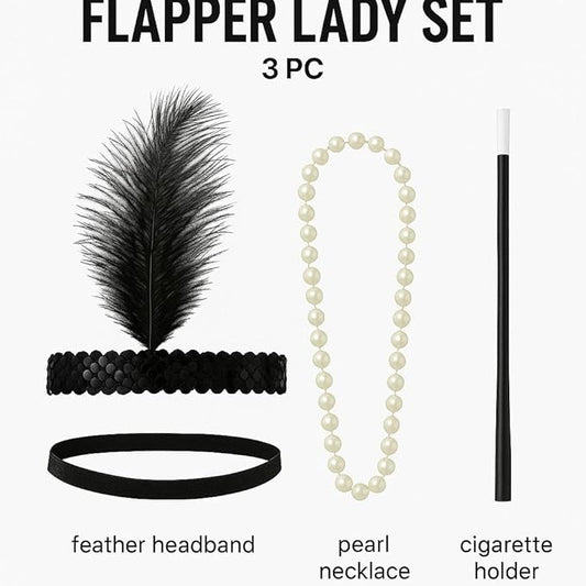 1920s Flapper Lady Costume Accessory Set – Pearl Necklace, Feather Headband & Cigarette Holder – Great Gatsby Fancy Dress for Adults, Vintage Party & Roaring Twenties Theme