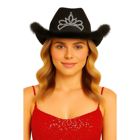 Cowgirl Costume Hats with Tiara and Fluff Trim – Set of 4 in Black, Red, White, Pink – Perfect for Hens Parties and Themed Events