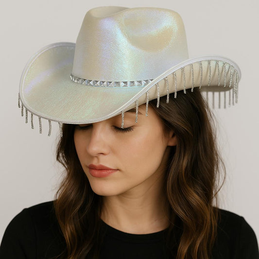 Set of 4 White Glitter Rhinestone Fringe Cowboy Hats – Perfect Accessories for Hen Parties and Bachelorette Celebrations