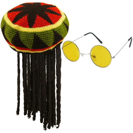 Adults Jamaican Rasta Hat with Dreadlocks & Yellow Frame Glasses Caribbean Set