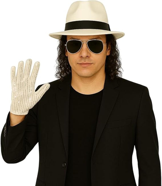 labreeze Halloween Pop Icon Costume Set – White Al Capone Gangster Hat, Black Sunglasses & Silver Sequin Glove – Fancy Dress Accessory Kit for Adults