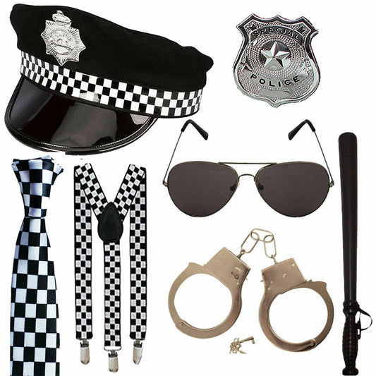 Men’s Zombie Police Costume Accessories Set – Includes Police Hat, Badge, Handcuffs, Black Sunglasses & Fake Blood – Halloween Fancy Dress Kit