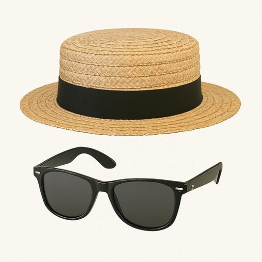 Classic Straw Boater Hat and Black Sunglasses Set – Vintage Skimmer Hat with Ribbon Band & Retro Shades – Fancy Dress Accessory Kit for Men & Women – Perfect for 1920s Costumes, Summer Parties, Stag Do