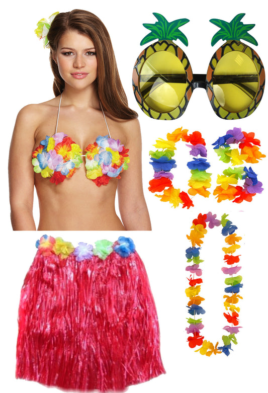Hula Grass Skirt Flower Bra 4 Pcs Lei Set Pineapple Glasses Ladies Hawaiian Hula Fancy Dress Party Costume