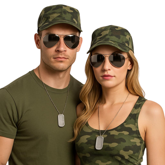 Military Costume Set for Adults – 3-Piece Army Fancy Dress with Camouflage Cap, Aviator Sunglasses, and Dog Tags – Set of 2 for Hen Parties and Stag Dos