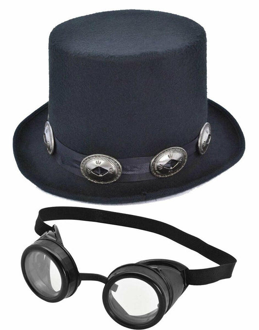 Rocker Black Top Hat + Plastic Goggles Steam Punk Fancy Dress Party Set
