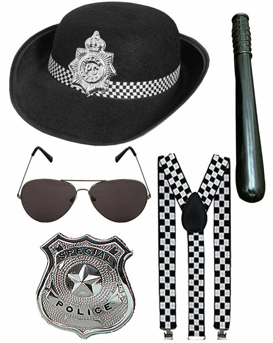 British WPC Police Cop Hat Braces Badge Truncheon Sunglasses 5 Pcs Costume Set