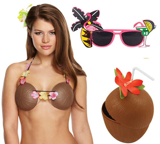 Ladies Brown Coconut Bra Plastic Cup Flamingo Glasses Hawaiian Beach Party Set