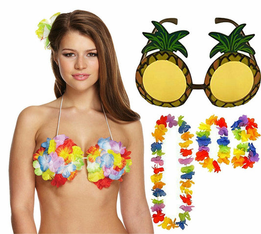 Ladies Hawaiian Flower Bra Pineapple Glasses 4 Pcs Lei Set Hula Fancy Dress