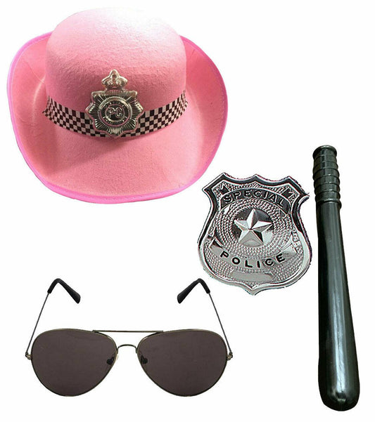 Ladies Police Constable Pink Hat, Glasses, Badge, and Truncheon: Fancy Dress Party Set