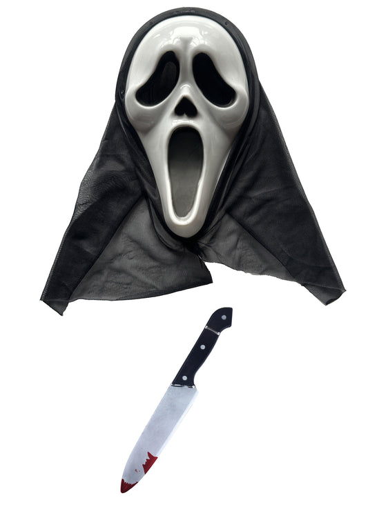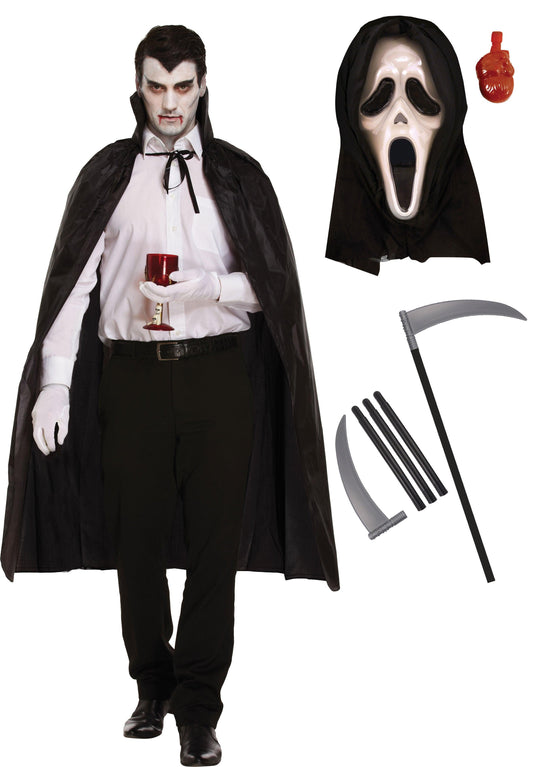 Black Long Dracula Cape with Collar Scream Bleeding Mask Plastic Reaper Scythe 110 Cm Halloween Scary Dracula Costume