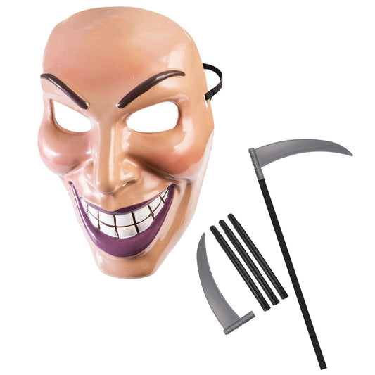 Male Evil Grin Purge Face Mask with Grim Reaper Scythe Plastic Prop 110 Cm Halloween Scary Smile Fancy Dress Party Costume