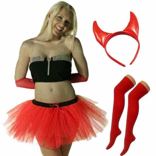 Red Devil Costume Tutu Skirt Socks Horns Headband Halloween Fancy Dress Set