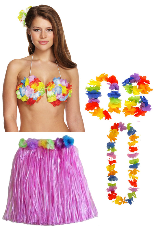 Hula Grass Skirt 40 Cm with Flower Bra Ladies Girls Hawaiian Summer Beach Party Fancy Dress Costume Set