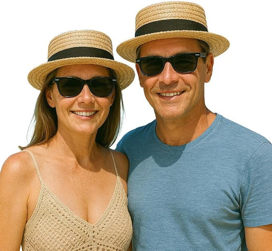 Classic Straw Boater Hat and Black Sunglasses Set for Couples – Vintage Skimmer Hats with Ribbon Band + Retro Sunglasses – Perfect Fancy Dress Accessory Kit for Gatsby Parties Product Description:
