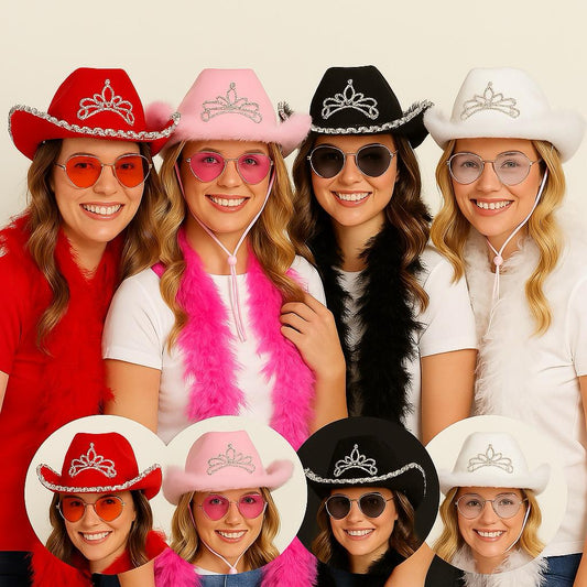 Cowgirl Costume Hats with Tiara and Fluff Trim – Set of 4 in Black, Red, White, Pink – Perfect for Hens Parties and Themed Events