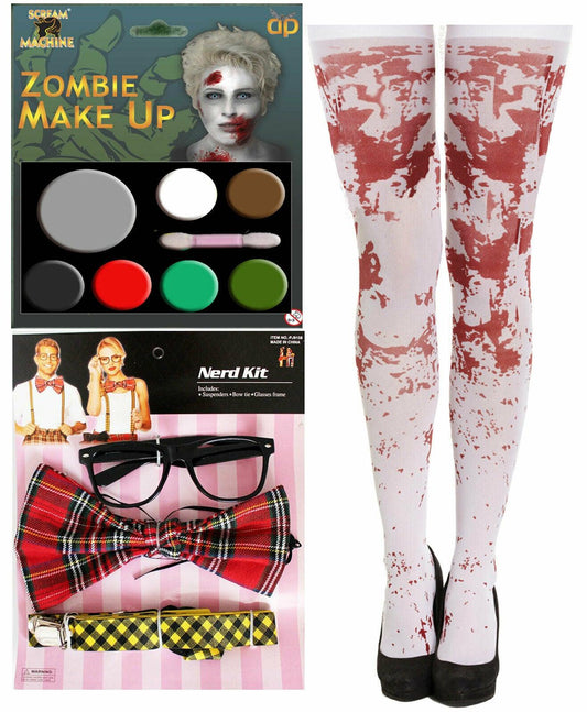 Zombie School Girl Nerd Kit Make Up Bloody Stocking Halloween Fancy Dress Set