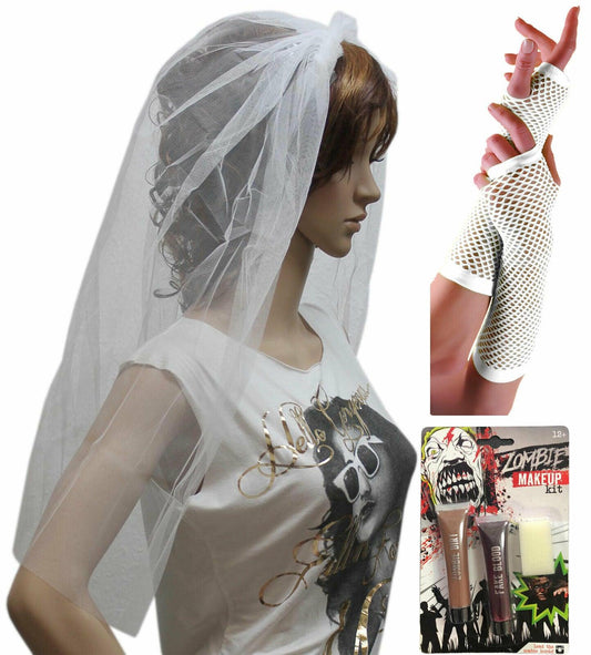 White Veil on Hair Band Fishnet Gloves Make Up Halloween Zombie Bride Outfit Kit