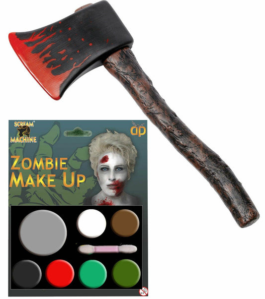 Zombie Multi Pallet Makeup with Bloody Plastic Axe Halloween Fancy Dress Set