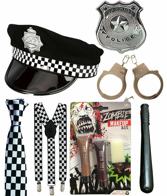 Zombie Police Man Hat Tie Braces Cuffs Badge Truncheon Make Up Halloween Set
