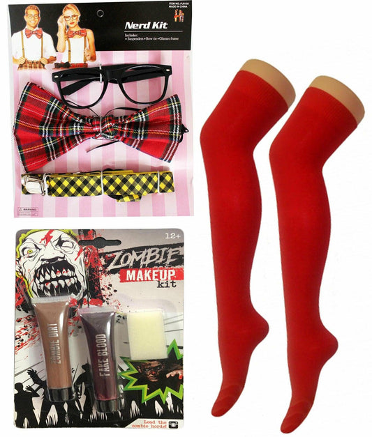 Zombie School Girl Nerd Kit Red Lycra Socks Make UP Halloween Party Costume Set