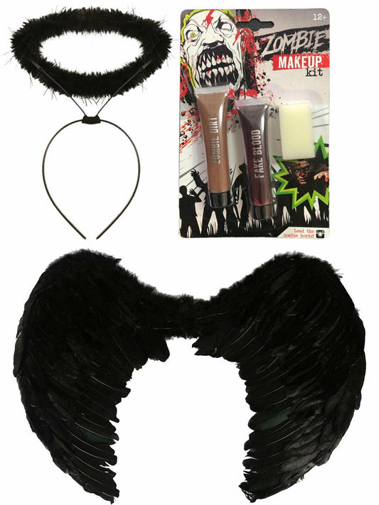 Black Large Feather Wing Angel Halo Zombie Make Up Halloween Fancy Dress Set