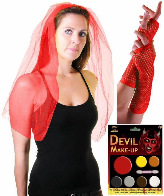 Veil on Hair Band Fishnet Gloves Make Up Halloween Horror Red Devil Costume Set